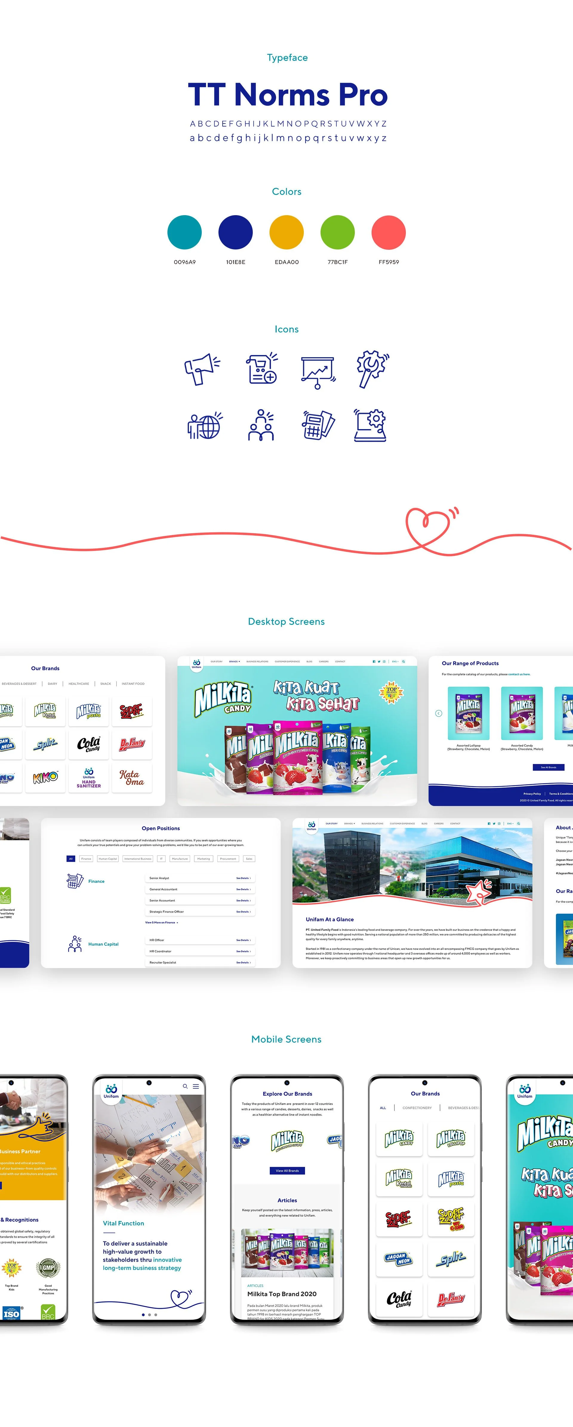 The user interface design is developed from Unifam’s identity, taking a minimalistic approach, yet conveys warmth and caring. A set of icons were crafted for their team’s divisions in a simplified line drawings to radiate a friendly look. We keep the style consistent by using these “Lifelines” as symbols of Unifam’s commitment to offer their best for their consumers. The outcome was a bright, colorful, and modern website that showcase the brand’s personality.
